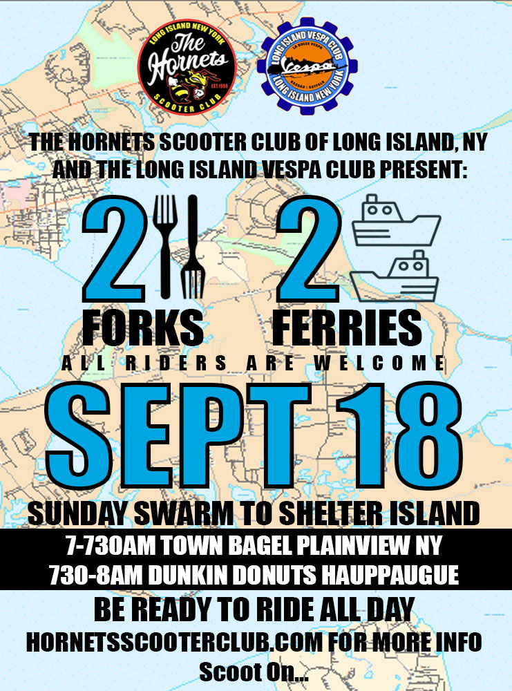 The 2 Forks / 2 Ferries Ride to Shelter Island is Sunday September 18th. It will be the longest Swarm we have done in a long time. The Pandemic slowed us down for a couple of years, but we are back and ready to swarm all over the Island. This will be along ride. be prepared to ride all day. If you want to participate but can not do the whole ride, come along and turn back whenever you want, we love the company, no matter how long it lasts. We will ride up the North Fork of Long Island to Greenport. There we pick up the first Ferry to Shelter Island. There we will have lunch and then tour the Island before reaching the south side of the Island. The we take a second ferry to the South Fork of Long Island. At that point we head back home along the South Side on Long Island. An adventure for sure, that you will remember for sure. Be prepared for a full day of riding, have an emergency plan and be prepared to see Long Island in a day.